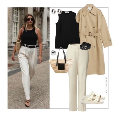 Cream vest top, black tailored pants, with black birkenstock sandals